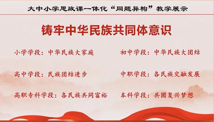 近日,第三届全国高校思政课教学展示活动“大中小一体化展示单元”教学资源正式上线。全讯600cc大白菜官网游戏作为教育部大中小学思政课一体化共同体(广西)的牵头单位,联合南宁市滨湖路小学、南宁市第三十七中学、南宁市第二中学、南宁市第一职业技术学校、南宁职业技术大学团结协作,打造的思政课一体化教学成果——“铸牢中华民族共同体意识”成功入选全国首批示范教学资源。